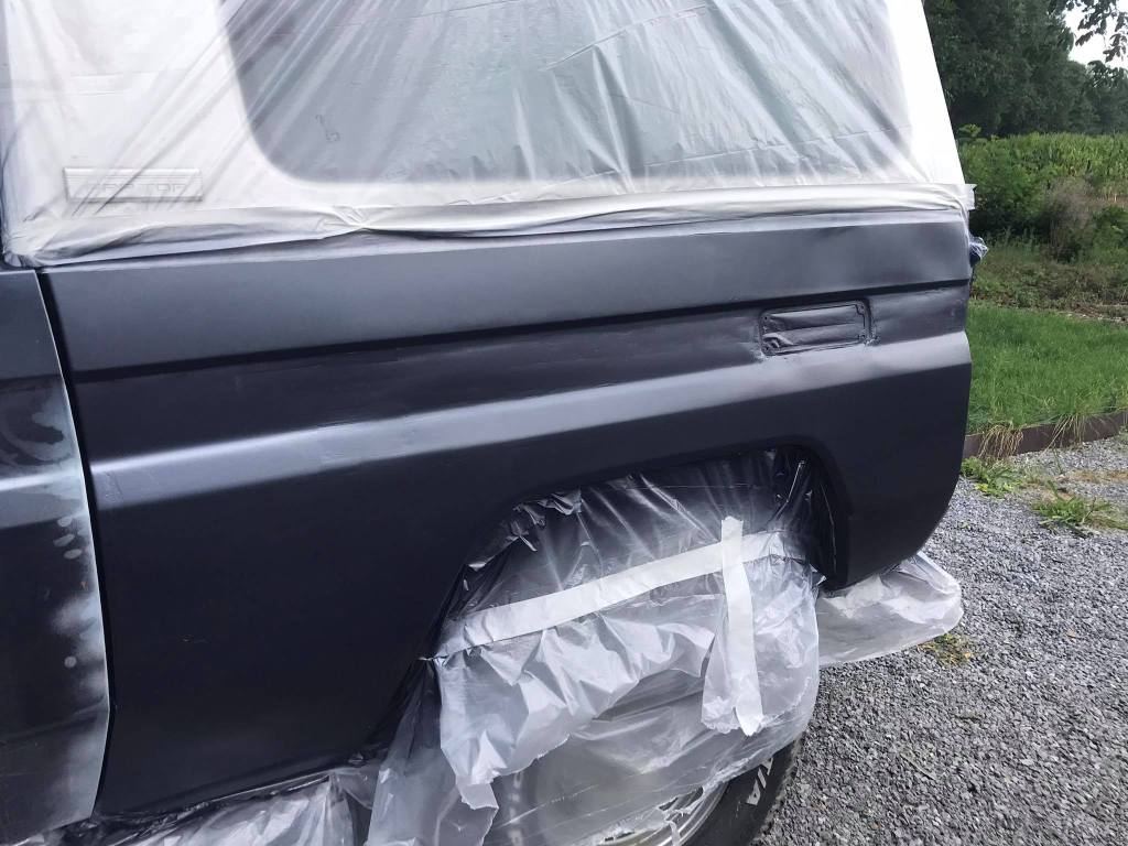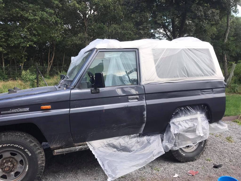 Het leukste werk van spuitwerk is natuurlijk het afplakwerk.. Zo’n tijdrovend werkje, maar het moet zeker gebeuren. Toen de jeep in de plastiek was gewikkeld konden we beginnen met het spuitwerk. Zet zeker een masker op tijdens deze klus, want dit is extreem slecht voor je longen!