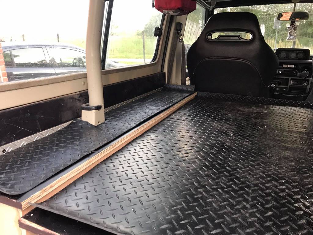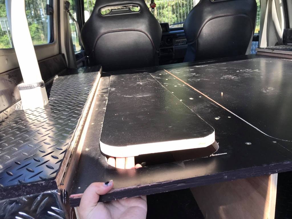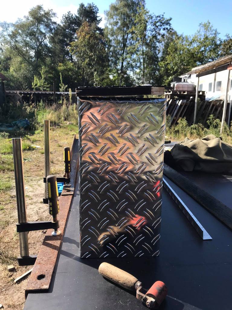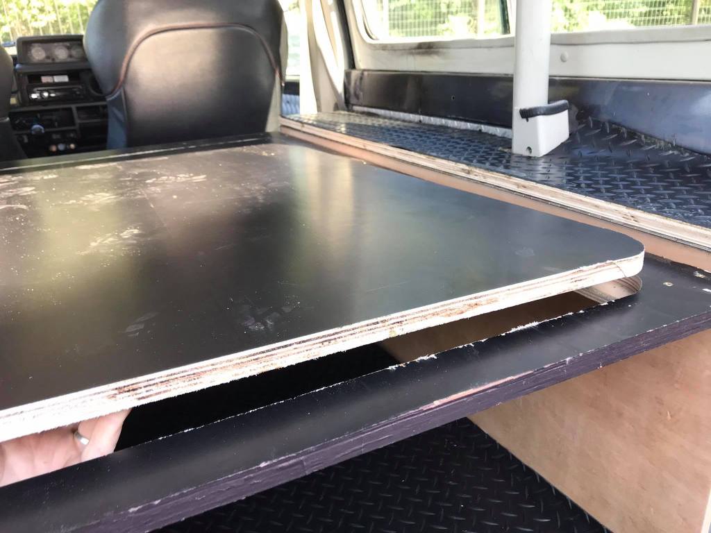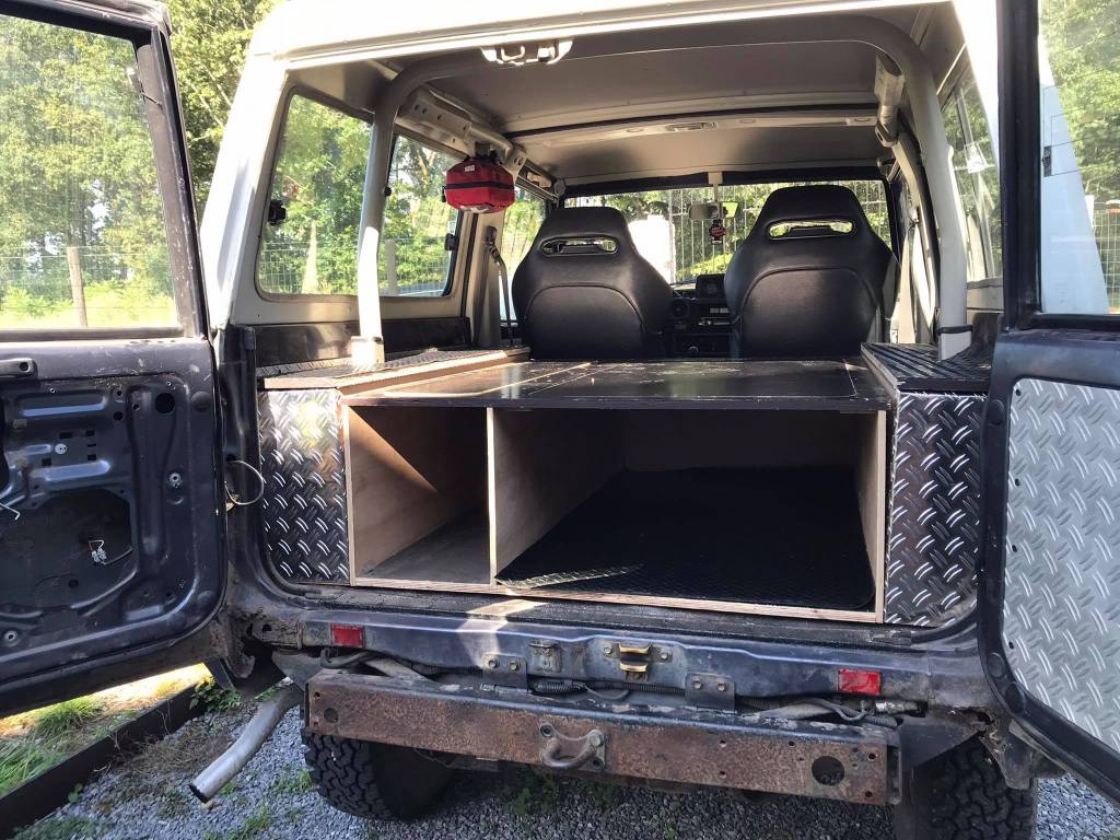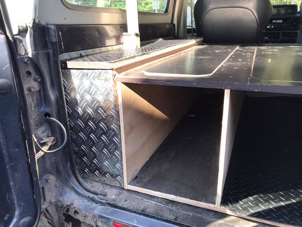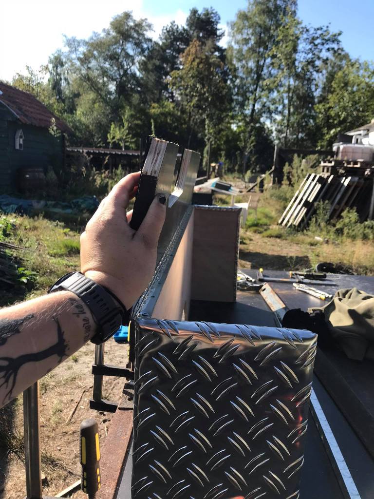 We hebben de schuiven op maat gemaakt van de deuren. Dan de zijkanten hebben we opgevuld met klapbakken zodat de middelste bak gestud staat. We zouden ook voor traanplaat-look gaan omdat de rest van de jeep zo ook is afgewerkt. Daarbuiten toont het erg chic en is het proper.